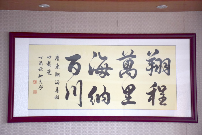 “翔程万里,海纳百川”,佛山市著名书法家亲自提笔,祝贺广东荣耀体育手机版集团20周年庆典。