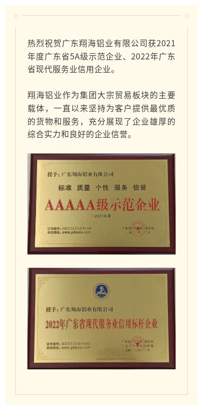 喜报 | 荣耀体育手机版铝业获评广东省5A级示范企业、现代服务业信用标杆企业